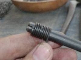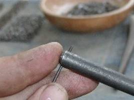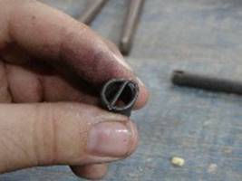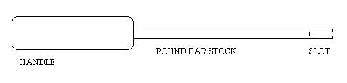 My theory is based on the fact that theta rings appear mostly in maille dated to before the 14th century, and in Persian maille, and has to do with the tools used in the manufacture of maille. In early 14th century Europe, we find references to what would appear to be a floor- or table-mounted crank-style mandrel used to coil wire into rings[1]. The reason for this is advances in technology that allowed much longer lengths of wire to be drawn consistently. In Persia, and in Europe prior to the 14th century, maillers would use a hand-mandrel to coil their rings. E. Martin Burgess, in his treatise “The Maille-maker’s Technique”[2] depicts a hand mandrel as a short length of round bar-stock set into a handle, with a hole drilled in one end in which to insert the end of the wire and thus start the coil (Fig 1). The hand mandrel I use (and which I have seen other examples of), on the other hand, uses a short notch in the end of the bar stock (Fig. 2).