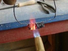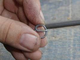 Next, the rings are annealed (Fig. 7). This is a normal step in the riveted maille process. In this case, I used a MAPP gas blowtorch, instead of a forge as would have been used in period. This deviation from period tools/methods was made for safety reasons. The annealed theta ring, once cooled, is now ready for the next step (Fig 8).
