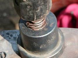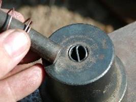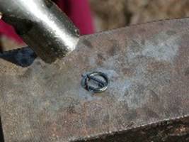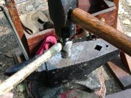 The next step in the riveted maille process involves flattening the rings so that the overlapped area can be punched for the rivet. In my case, I use a ring flattener, for its ease in use. The flattener is set on the anvil, then the ring is placed in the chamber (Fig. 9). Then the piston is inserted on top, and the ring is struck with the hammer (Fig. 10).